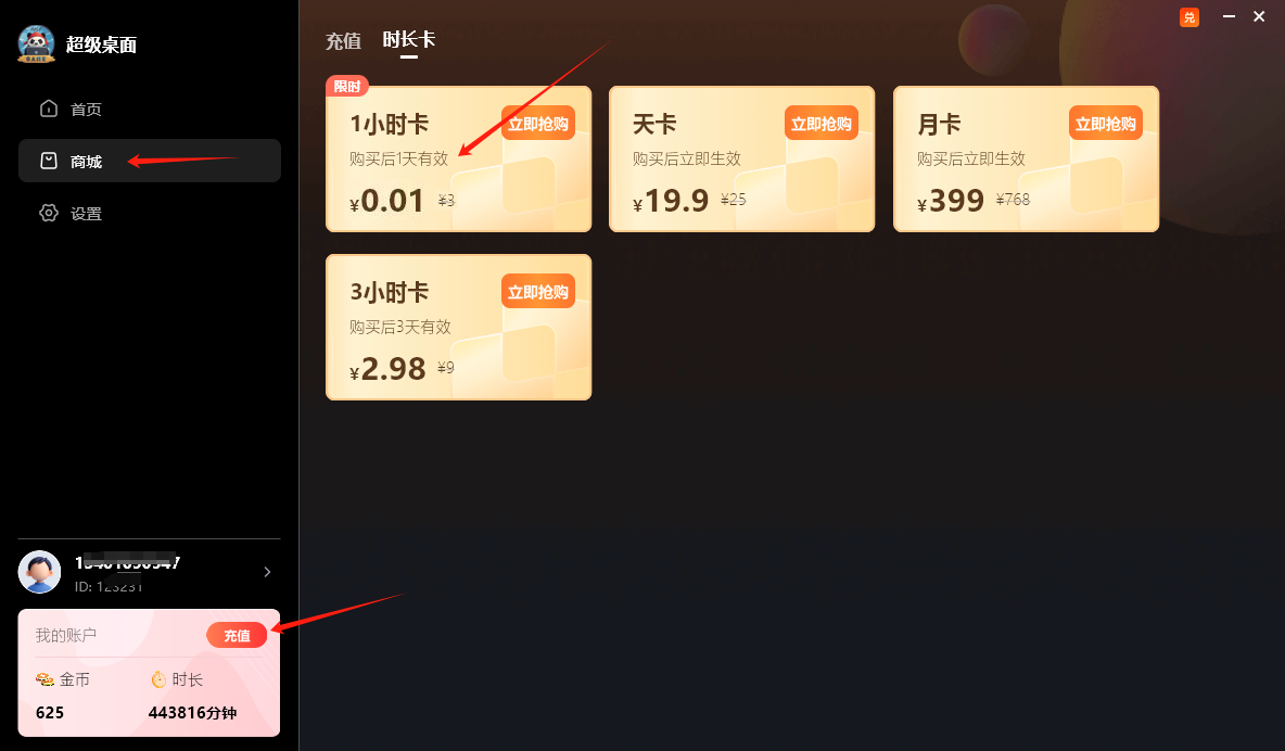免费试玩/续费1元1小时/包天19.9元/包月399元